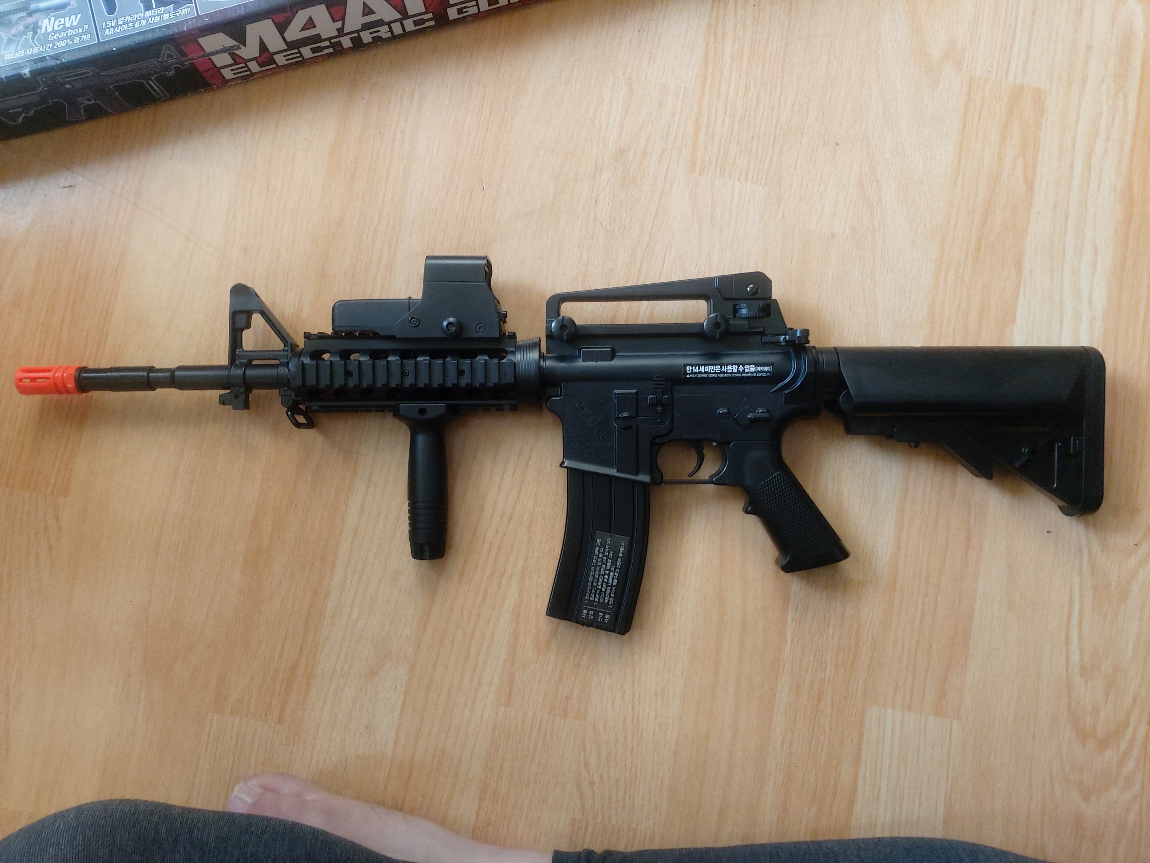 이것은(조준용 모니터를 달았지만) 전동으로 발사하고 연사가 가능한 M4A1 전동소총입니다. 소총 위력은 0.14j(연발시 한발당 0.2j) 가깝고, 탄창이 빌 때까지 연발을 쏠 수 있습니다(Save모드에서 쏘려고 하면 방아쇠가 잘 안당겨지니까 쏠 때는 Outo모드로 설정해서 단발로 쏘거나, Semi 모드로 설정해서 연발로 쏘고 방아쇠를 목표물을 향해 당기시길 바랍니다. 그리고 건전지 AA사이즈 6개가 필요합니다.). 그리고 사람에게는 쏘지 맙시다.