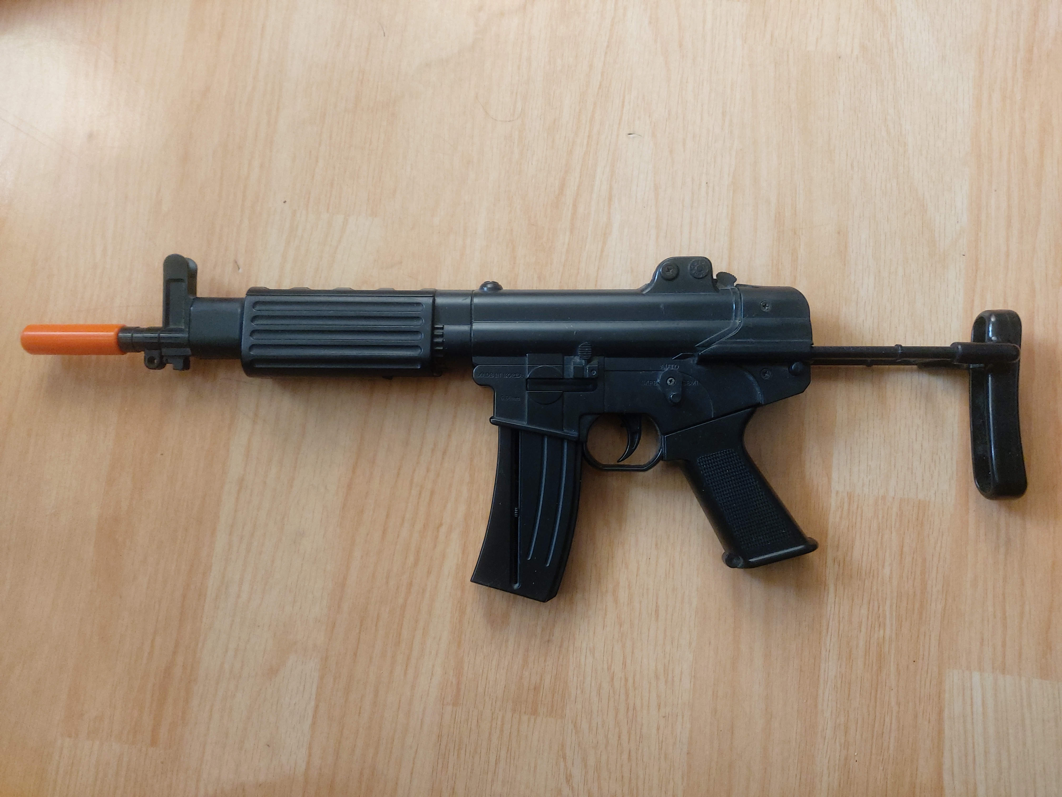 한국식 소총 생각나는 알파벳 K로 시작되는 K-1 소총입니다. 소총 위력은 0.14j 가깝고, 탄창에 최대 비비탄 15발을 쏠 수 있습니다(Save모드에서 쏘려고 하면 방아쇠가 잘 안당겨지니까 쏠 때는 Outo모드로 설정해서 단발로 쏘거나, Semi 모드로 설정해서 연발로 쏘고 방아쇠를 목표물을 향해 당기시길 바랍니다.). 그리고 사람에게는 쏘지 맙시다.